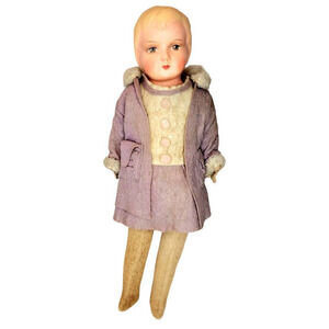 Step back in time with a vintage 1940s Composition Head Doll, featuring a charming fabric body and lovely blonde short modeled hair. This classic doll is a testament to nostalgia and enduring beauty.