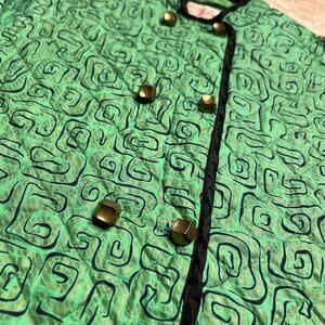 Vintage house coat / dressing gown is green with black geometric print and subtle gold colored details. Nehru mandarin collar, double breasted with square buttons. Wide sleeves with a mod cut. Upholstered quilted style material. Satin black trim, cuffed sleeves, front pockets. Vintage 1940s.