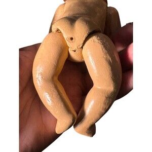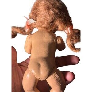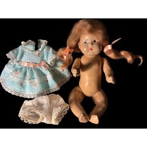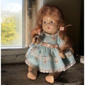 This vintage doll from the 1940s is a small bisque doll with wavy red hair and blue eyes. She is dressed in a floral dress and is 7 inches wide. The doll is a girl doll with a light complexion and has an original design. This collectible doll is part of a vintage brand and is perfect for doll collectors or vintage toy enthusiasts.