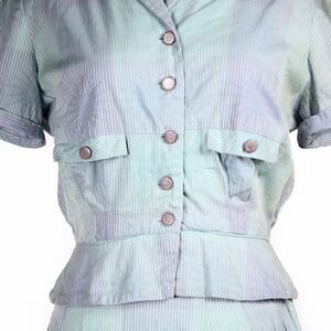 * Closure: Skirt has side metal zipper and black button (probably replaced). Top has blue grey buttons with a swirl pattern.