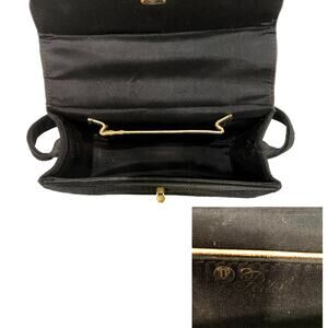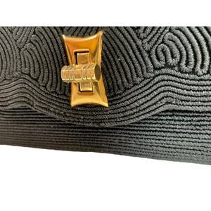 Beautiful little black cordé box bag from the 40s. Intricate pattern on front, concentric loops on back and top. Top of handle is straight cordé lines. Underside of handle, ends and bottom of bag are fabric similar to silk, acetate or ribbon. Interior is black silk or similar with one small slip pocket with gold trim. Gold tone twist clasp
