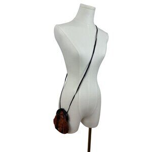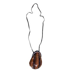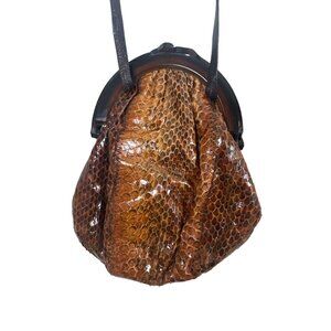 Vintage brown snake skin crossbody coin purse for women in size S. Trendy, compact design with a long strap, kiss lock closure, and a main compartment.