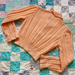 Vintage 40s/50s Peach Hand Knit Crochet Ruffled Peaked Puff Sleeve Cardigan Sweater