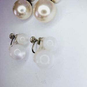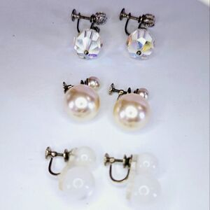 This is a lot of three pairs of vintage earrings. They are all screw back style which likely places them around mid century. They are similar styles. Two are dangle and the lucite is a faux dangle. The top pair has a large crystal dangling under a smaller prong cut crystal. The second is a beautiful light pink faux pearl from the '40s. The bottom pair is made of lucite. This style was popular in the '60s called soap bubble earrings. Very pretty. It is hard to capture in the pictures but they have a gorgeous opalescent sheen. They are all fully functional and would make a great addition to any vintage collection.