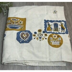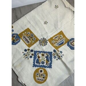 Vintage 47” Square Linen Tablecloth Blue Yellow Floral PA Dutch Style Stained
