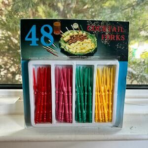 Unopened vintage package of 48 colorful plastic cocktail forks in red, pink, green, and yellow. Perfect for serving appetizers, cheese cubes, fruit, or party snacks. The retro packaging features classic mid-century entertaining style.
