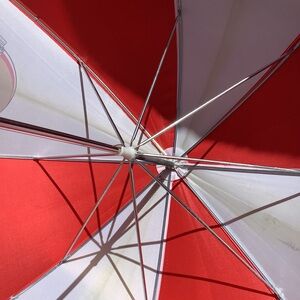 Vintage San Francisco 49ers Red and white umbrella featuring 49ers logo and helmet design. Wooden handle. Has stains especially on crease from storage. No holes. Works.