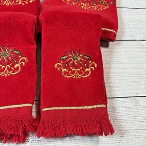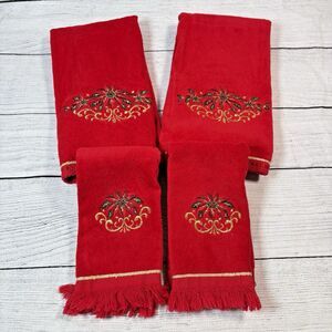 Vintage 4pc Christmas Towel Set 2 Hand 2 Fingertip Red Gold Embroider Poinsettia