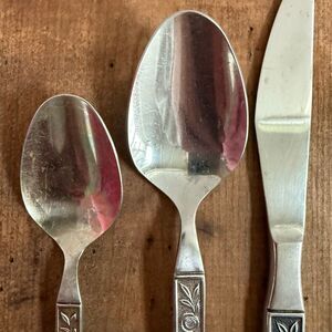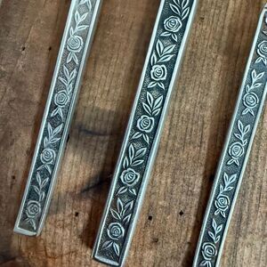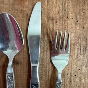 Vintage four piece Mexicali rose pattern stainless steel flatware set by Interpur. This five piece sat, includes a teaspoon, dinner spoon, knife and fork
