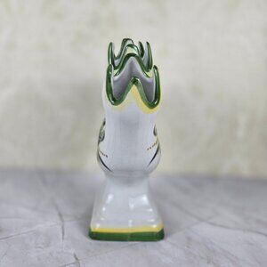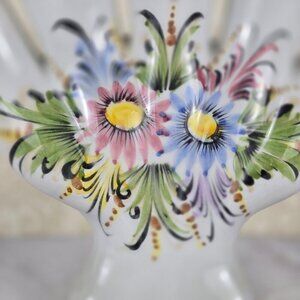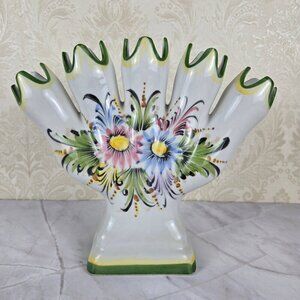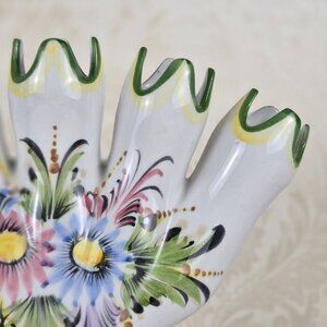 This vintage vase is stunning all on its own, but add flowers and it goes next level. Five individual "fingers" are connected at the bottom to hold the water. Hand painted with delightful florals on both sides and edged in green. There is crazing on the piece, but that does not deter from the beauty. Made in Portugal.