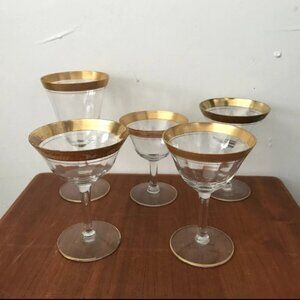 Vintage 5 Glastonbury Rose Lotus Fluted Gold Encrusted Sherbert Wine Glasses Set