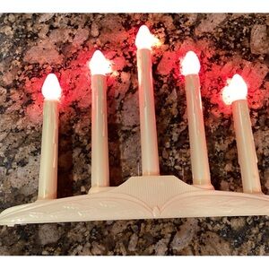 Vintage 5 light Candolier with red bulbs. Some bulbs have scratched coatings - please see pics. 3 available at time of listing