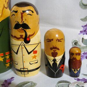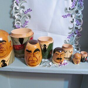 From largest to smallest the dolls appear to be Gorbachev, Brezhnev, Stalin, Lenin, and I'm not sure about the smallest but it may be Friedrich Engels