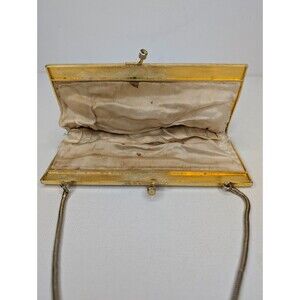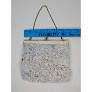 * Features: single interior pocket; white beaded exterior, gold tone with white ornate design on top; kiss lock clasp; satin interior, snake chain. Handmade in Hong Kong
