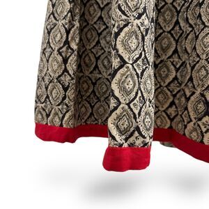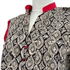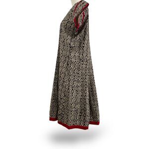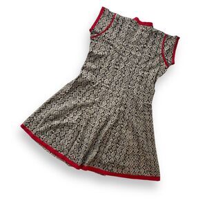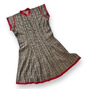 Vintage 50s 60s Handsewn A-line Dress Blk/Creme with V Neck, Red Stand up Collar