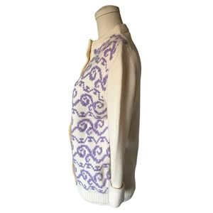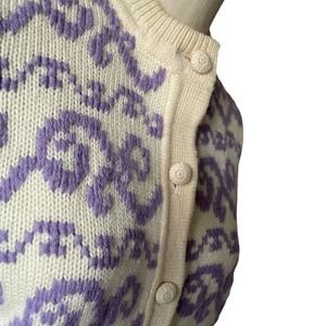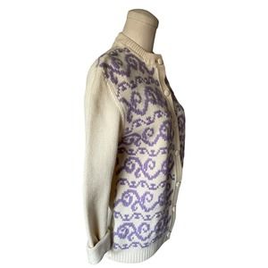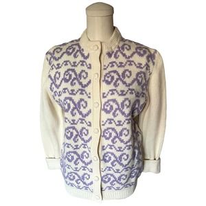 Vintage 50s 60s JOYCE Ivory Purple Swirl Knit Crewel Cardigan Wool Sweater