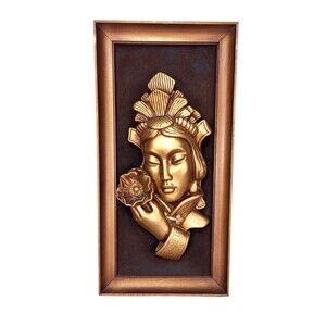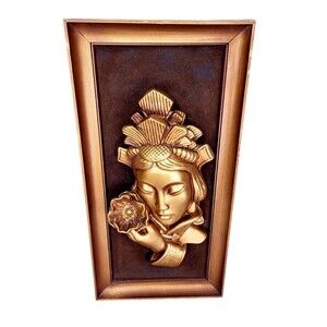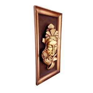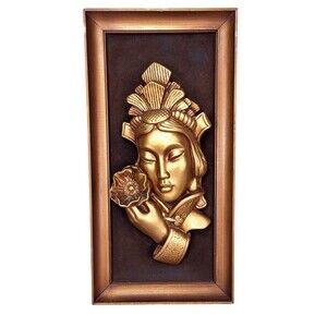 Beautiful very rare, hard to find MCM metallic gold Asian woman holding a lotus flower 3D wall art, brown velvet back, gold wood frame, Tretchikoff green girl era, feels like stone/resin/ceramic heavy piece,