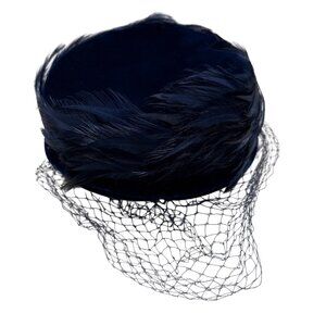 Vintage 50s 60s Navy Velvet Feather Pillbox Hat w/ Veil 22.5" Circ Retro Formal