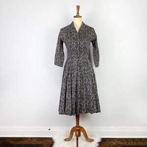 Vintage 50s 60s grey and black damask tapestry dress pleated skirt Size XS