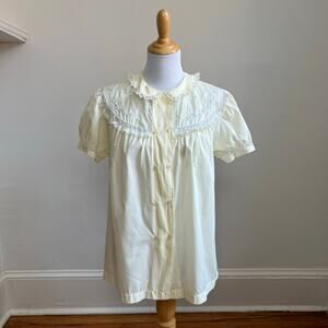 Cozy up in this romantic vintage Barbizon Zephaire pajama set from the 1950s. Crafted from their signature Zephaire Batiste—a soft, breathable cotton —this set features a pastel yellow hue, delicate floral embroidery, lace trim, and a charming Peter Pan collar. The button-down top and elastic waist pants offer a relaxed, roomy fit.
