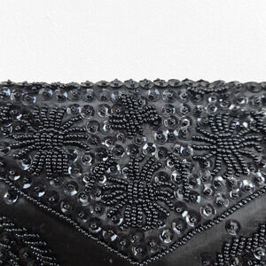 Vintage 50s Black Beaded Satin Evening Clutch Made in Japan Floral Cocktail Bag