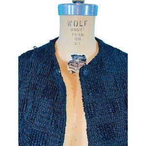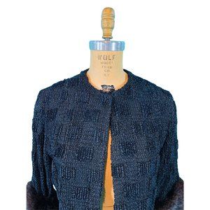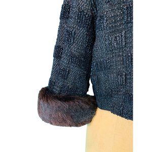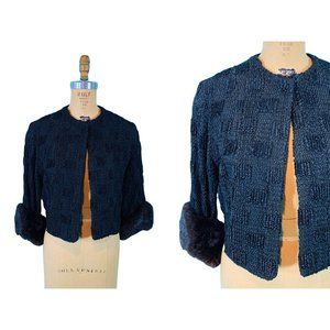 Pop this lovely vintage 1950s black ribbon/loop, top/jacket over a cocktail dress before stepping out the door! It is so sophisticated with brown fur cuff details and has a snap closure at the top. Top is lined and I am unsure if the fur on the cuffs is real or not.