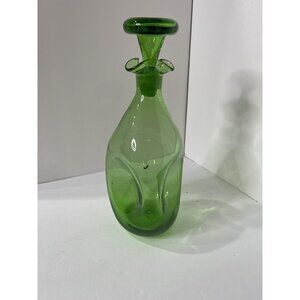 This stunning 1953 Benko Glass decanter is a vintage piece from the mid-20th century, handmade in the United States using the hand-blown glass production technique. The pinched shape and green color make it a unique addition to any collection, while the lid/stopper feature adds a touch of elegance.