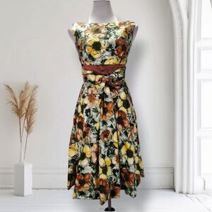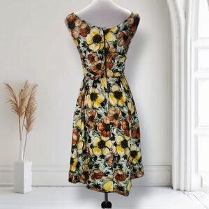 Vintage 50s Boat Neck Fit Flare Dress Size XS Yellow Brown Floral Print Sequin