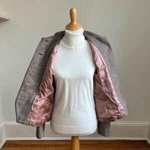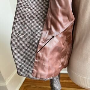 This structured blazer fits like a modern US Large and features a soft pink satin lining, classic lapels, and a slightly cropped silhouette.