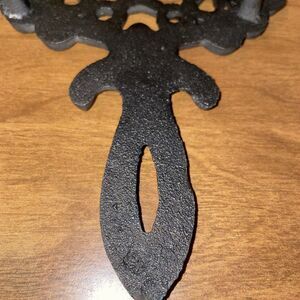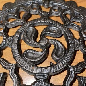 This is a vintage cast iron trivet made by John Zimmerman in the 1950s. It has a footed design and features an all-over black painted finish. The trivet is medium-sized and has a country style, making it suitable for all occasions. The trivet is made of iron and has the brand JZH stamped on it. It is perfect for use in the kitchen and is a great addition to any collection of vintage kitchenware.