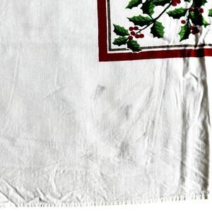 Vintage 1950's printed cotton Christmas tablecloth done in colorful holly leaves, berries and flowers. Sadly this cloth is in poor condition despite the good colors and wonderful printed design - flaws include multiple stains and nickel sized holes. Best as a cutter cloth for the crafter - this piece is vintage/as found. Price reflects condition.