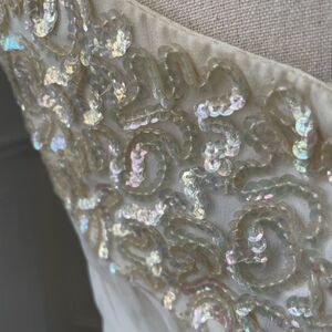 Vintage 50s Emma Domb San Francisco formal tea length cocktail or special occasion dress in ivory with wide neck and iridescent sequin detailing. I think the overlay is silk, but due to the age there’s of course no fabric content. There is acetate lining and some tulle underneath for a little oomph, but you could add more tulle if you wanted. Back zip closure. These dresses sell for hundreds of dollars, but I have knocked off a little bit from the price for dry cleaning. There is some yellowing and some dirt patches near the hem in the back including two very small holes in the overlay that don’t go all the way through. I recommend having this dress professionally cleaned. Laying flat measures 44 inches shoulder to hem, 12.5 inches straight across the waist and 16 inches armpit hit with front seams to accommodate cup size. It is featured on my size small dress form where it fits well. The tag size in this piece says 10, but that is vintage sizing so please double check measurements to ensure the proper fit for you. Coquette balletcore Mermaidcore mermaid core mcbling Taylor swift