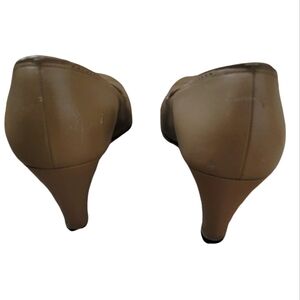 Good pre owned condition. Vintage - 50's Ferragamo Tan Leather Classic Heels. Round Toe. Ferragamo Gold Logo button. Slip on. 2.75" stacked wood heel. Made in Italy 6 Narrow