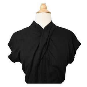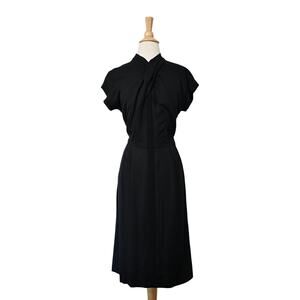 Vintage 50s dress. Beautiful and timeless. Black rayon blend with short sleeves. Dramatic neckline that is ruched and gathered like a shawl or scarf. Then down the center is a crochet wide stripe. Nipped waist. Pencil skirt with pleats at the waist. Back metal zipper.