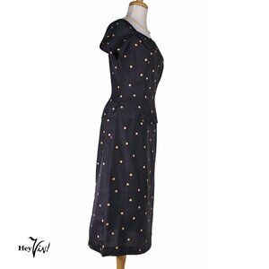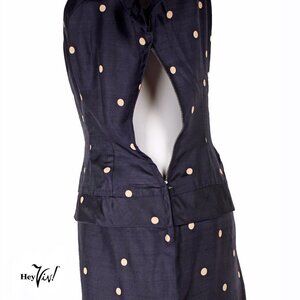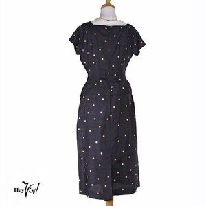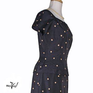 Vintage 50s Fitted Sheath Dress - Navy Silk Polka Dot - Metal Zip - S - Hey Viv
