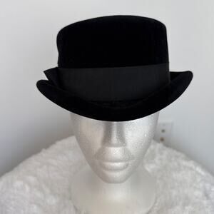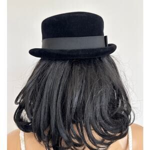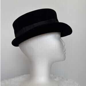 Elegant French vintage 1950s black velvet cocktail top hat featuring a structured crown, short upturned brim, and wide grosgrain ribbon band. Originally designed with a face veil (now missing), it retains its timeless retro silhouette and sophisticated style. Perfect for collectors, vintage fashion lovers, or as a statement accessory for formal and retro-inspired looks. A chic mid-century piece that pairs beautifully with dresses, suits, or evening wear.