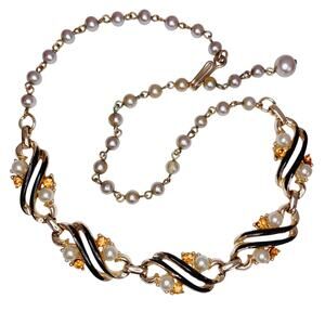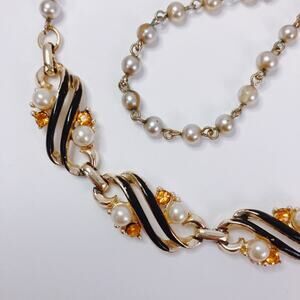 Glossy black-and-gold S-curve enamel links play against luminous faux pearls and warm topaz-colored rhinestones. A hand-wired pearl extender and linked panels keep the look tailored and unmistakably mid-century.