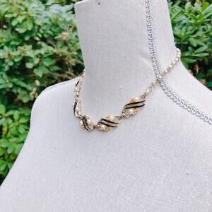 Vintage 50s Gold Tone Black Enamel Faux Pearl Rhinestone Link Choker Necklace