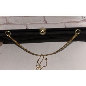 This vintage 50's handbag is a stylish addition to any collection. The black satin exterior is accented with a gold chain strap, attached mini bow, and charm. The clutch/purse style is perfect for a night out or special occasion. The small size makes it ideal for carrying your essentials, while the black lining provides a sleek interior. The hardware color is black, which complements the overall design. This handbag is a must-have for any fashion-forward woman.
