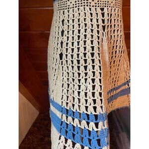 Step back in time with this adorable vintage half apron! This piece exudes the charm of the 1950s with its handmade, open-weave crochet design in classic white and blue.