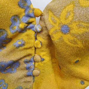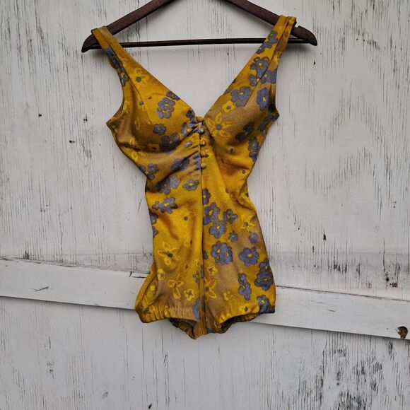 This vintage Jantzen one-piece swimsuit is a true beauty from the 1950s. With a stunning golden yellow with pale blue floral maillot design in multi-color, this swimsuit is perfect for any pin-up girl who wants to make a statement. The size tagged a vintage 10 but tuns small