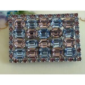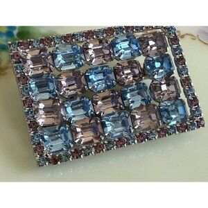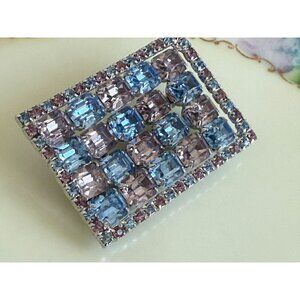 Elegant vintage 1950s Kramer NY brooch featuring stunning blue and pale lavender rhinestones in a rectangular design. Perfect for adding a touch of retro charm to any outfit. This measures 2.25x1.5" . This is in excellent condition.