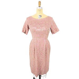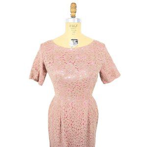 Enjoy a night out with the girls in this beautiful 1950s dress! This vintage sheath has a tan lace & soutache fabric over a pink lining. It's perfect for grabbing drinks out with the girls or for another cocktail occasion! Dress is lined(as shown) and zips closed in the back with metal zipper and has two hook & eye closures above it.