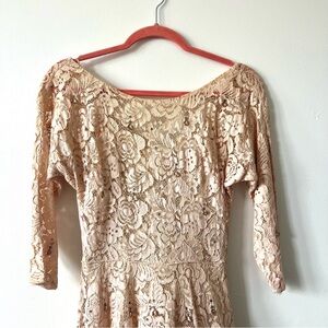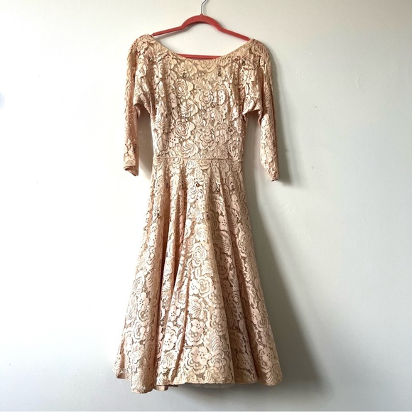 Vintage 1950s Tan/Blush Lace Gown. Such beautiful construction and detail. The dress is studded with rhinestones and abalone shells. Magical! Beautifully constructed with a lining and petticoat! The slight taffeta under the skirt has nice body. Would be a perfect wedding dress! If you added a corset back to it you could easily size up! Lots of possibilities!