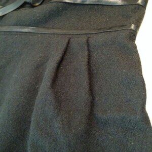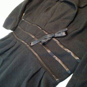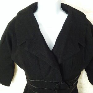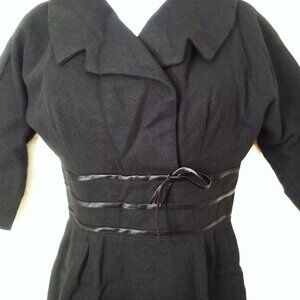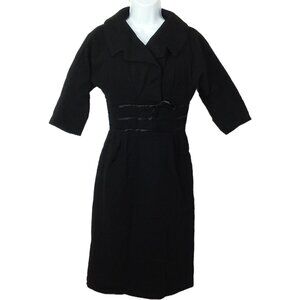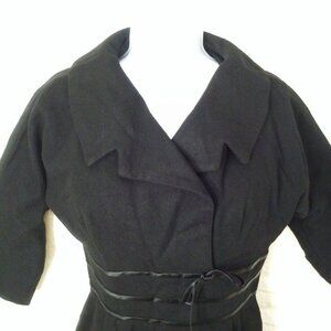-- Garment workers union tag made in USA, Ladies -medium 8(36), step-in knee-length, large cowl crossover open collar, fitted empire waistline ribbon detail bow, 3/4 dolman sleeves, gather kick pleats pencil skirt, 20" metal back Zipper, Solid pattern, structured midweight textured woven material, Dry Clean or handwash delicate wool fabric, in black colorway.