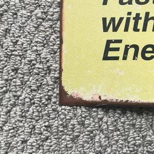 Metal like sign sheet that reads Drink Coffee, Do Stupid Things Faster With More Energy. Honestly hilarious to keep in your kitchen or work space, brings some humor and laid back feeling to the area. Has 4 little holes at each corner for push pens to easily hang this. Measures about 12 1/2" tall by 16" wide. No flaws, has a slight intentional distressed look to it.