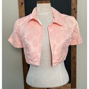 Vintage 50s Pink Satin Dress Bolero Set L Floral Brocade Cocktail Party Formal