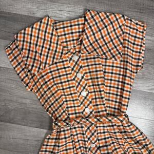 Vintage 50s Plaid Shirtwaist Day Dress Belt Button Front Orange White XS