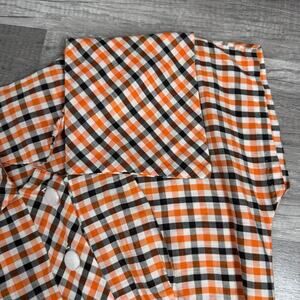 True vintage 1950s gingham day dress in orange, and white check. Features a wide statement collar, cap sleeves, buttions down to bottom stitching, matching fabric belt with vinyl backing. Classic midcentury shirtwaist silhouette with a cinched waist and modest skirt length. No tags may be handmade