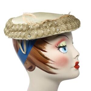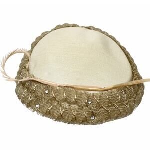 Vintage Platter Hat Dark Ivory w Ruffle and Rhinestones